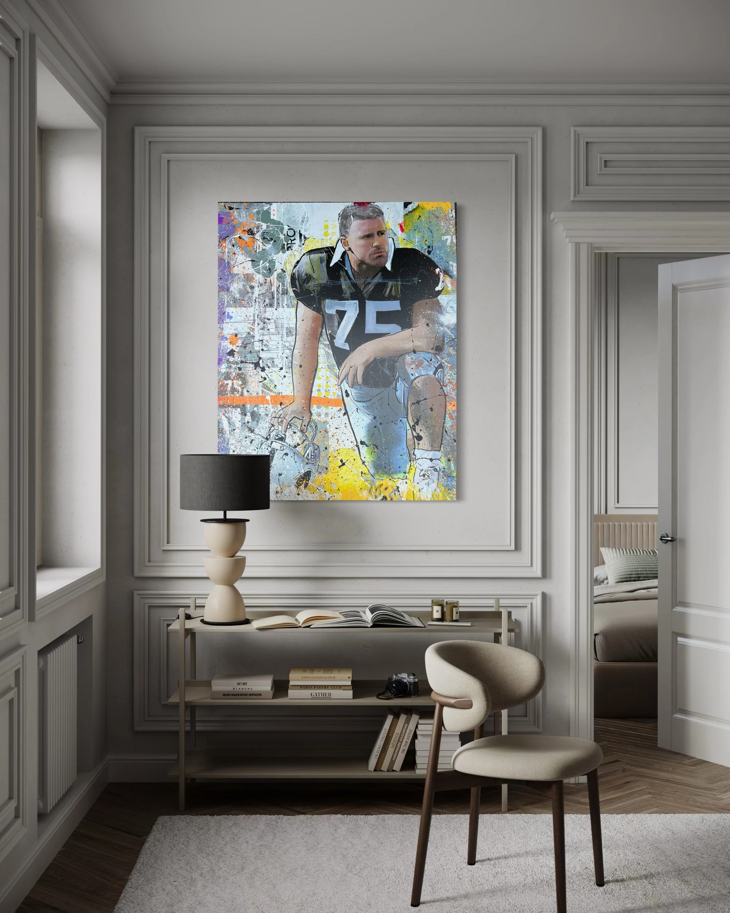 Captured in a rare, reflective pose, this 40”x50” wrapped metallic canvas showcases Howie Long not just as the warrior—but the architect of intimidation. Hand-painted splatter and brushwork create a backdrop of controlled chaos, mirroring the force he brought to the gridiron. This is the calm before the snap, the locked-in intensity of a Raiders legend in full command of the moment.
